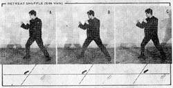 前进时,不要用交叉步或跳步,而要用滑步。开始进,可能会感到动作笨拙,速度缓慢,但是只要每天坚持练习,就会提高速度,并变得得心应手。如右图(正视、侧视、背视),以警介式小心随即跟上,立即恢复姿势,重复这个过程。