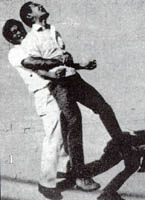 注意:从你前面抱起你的袭击者,不可能长时间地抱着你,即使你未攻中其小腹,也会有其它的两三个选择来攻击他。而从你身后抱起你的人,就要冒着你的头向后撞时满脸开花、脑袋开花的危险了。