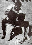 示例一:袭击者将李小龙的右手反锁住(如下图所示),李小龙便用侧踢攻其身体的中部,并用另一只脚旋踢袭击者的同一部位,从而重创对手同一部位。(注释:当有人象下图所示那样反锁住你时,在其尚未将你别倒在地之前,你必须迅速地进行反击。) |